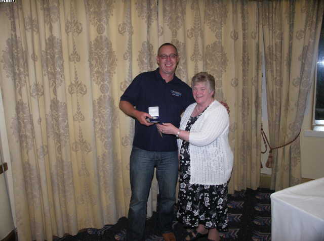 Steve Moss (E) receives his third place individual medal from Ysabel Ball, wife of vice-chairman Steve Ball.