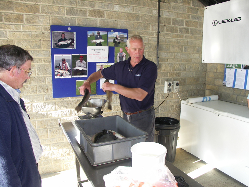 Jerry Bolus(L) looks on whilst head warden John Seaton weighs his catch.