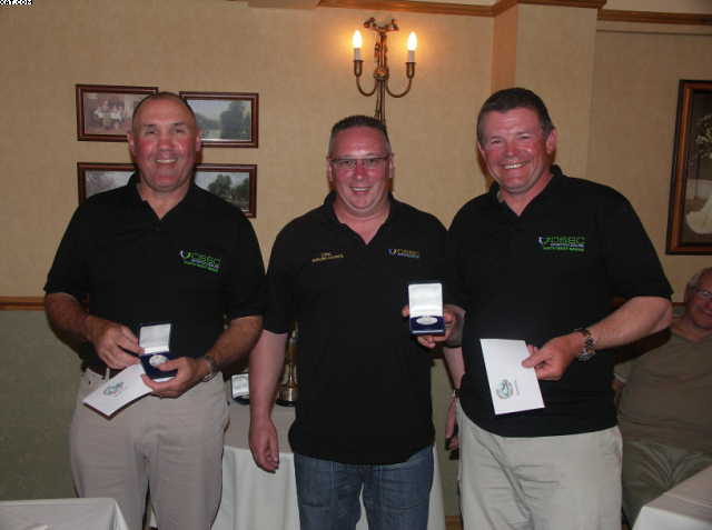 Fraser McConnell presents Ian Foxley and Nigel Evans (South West) with their runners-up medals and tackle vouchers from Eyebrook Reservoir.