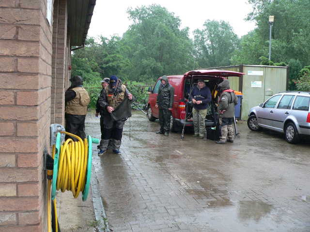 Competitors stand around in the still pouring rain waiting to weigh in. previous quit next